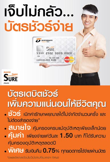 บัตรเดบิตชัวร์ "เจ็บไม่กลัว บัตรชัวร์จ่าย" บัตรเดบิตที่สามารถเบิกถอนเงินสด และรูดใช้จ่ายที่ร้านค้าที่มีเครื่องหมาย MasterCard อีกทั้งยังให้ความคุ้มครองอุบัติเหตุสำหรับผู้ถือบัตรสูงสุดถึง 100,000 บาท ค่ารักษาพยาบาล 5,000บาท/ครั้ง อีกทั้งอภิสิทธิ์พิเศษจากการบริการรับเงินคืน 0.75% ของทุกยอดการใช้จ่ายผ่านบัตรเข้าบัญชีหลักที่ผูกกับบัตร