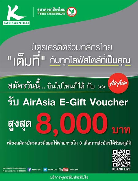 สมัครบัตรเครดิตร่วมกสิกรไทย "เต็มที่" กับทุกไลฟ์สไตล์ที่เป็นคุณ รับ AirAsia E-Gift Voucher สูงสุด 8,000 บาท* เพียงมียอดใช้จ่ายภายใน 3 เดือน หลังบัตรได้รับการอนุมัติ (โดยต้องมียอดใช้จ่ายจากร้านค้าของบัตรเครดิตร่วมนั้นๆ 5,000 บาทขึ้นไป )