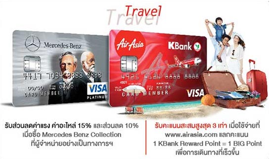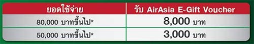 - รับ AirAsia E-Gift Voucher มูลค่า 8,000 บาท เมื่อใช้จ่ายตั้งแต่ 80,000 บาทขึ้นไป หรือรับ AirAsia E-Gift Voucher มูลค่า 3,000 บาท เมื่อใช้จ่ายตั้งแต่ 50,000 บาทขึ้นไปภายใน 3 เดือน นับจากเดือนที่บัตรได้รับอนุมัติ เพื่อใช้แทนเงินสดในการซื้อ/เป็นส่วนลดบัตรโดยสารเครื่องบิน และ/หรือซื้อสินค้าและบริการผ่าน www.airasia.com (ตามเงื่อนไขที่แอร์เอเชียกำหนด)