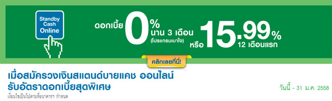 สมัครวงเงินสแตนด์บายแคชจากสแตนดาร์ดชาร์เตอร์ดออนไลน์วันนี้ รับดอกเบี้ย 0% นาน 3 เดือน สำหรับลูกค้าเบาใจ รับดอกเบี้ย 15.99% นาน 12 เดือน (สำหรับโปรแกรม Cash Delivery Day 1)