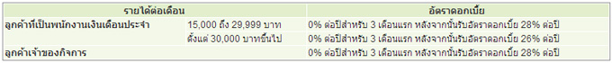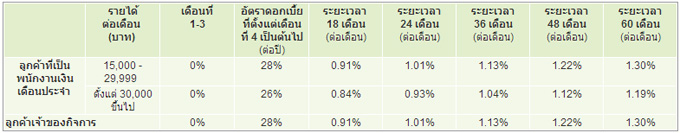 - สำหรับลูกค้าที่ใช้บริการเบาใจ รับดอกเบี้ยพิเศษ 0% ต่อปีสำหรับ 3 เดือนแรก หลังจากนั้นธนาคารฯ จะคิดอัตราดอกเบี้ยในอัตราปกติ รายละเอียดตารางด้านล่าง