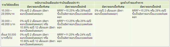 - สำหรับลูกค้าใหม่ที่ใช้บริการโอนเงินเข้าบัญชี (Cash Delivery Day-1) หรือการเบิกถอนเงินสดจากตู้เอทีเอ็ม ธนาคารฯ จะคิดอัตราดอกเบี้ย 15.99% ต่อปี 12 เดือนแรก หรือ 0% ต่อปี 2 เดือนแรก ขึ้นอยู่กับลูกค้าว่าต้องการเลือกอย่างใดอย่างหนึ่ง ซึ่งอัตราดอกเบี้ยนี้เป็นแบบลดต้นลดดอก นับตั้งแต่วันที่ธนาคารฯ โอนเงินเข้าบัญชี หลังจากครบกำหนดตามเงื่อนไข ธนาคารฯ จะเรียกเก็บอัตราดอกเบี้ยตามที่กำหนด ดังนี้