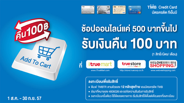 - เมื่อซื้อสินค้าผ่านบัตรเครดิต TMB ตั้งแต่ 500 บาทขึ้นไป/เซลล์สลิปที่เว็บไซต์ www.itruemart.com หรือ http://store.truecorp.co.th หรือ www.weloveshopping.com รับเงินคืน 100 บาท (คิดจากยอดใช้จ่ายจริงหลังจากหักส่วนลดต่างๆ แล้ว) ระหว่างวันที่ 1 ส.ค. - 30 ก.ย. 57 มีสิทธิ์ได้รับเงินคืนจำนวน 100 บาท (สูงสุด 200 บาท/บัตร ตลอดรายการ)