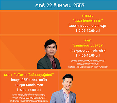 - ต้องจองสิทธิ์โปรโมชั่นสินเชื่อภายในงานเท่านั้น โดยต้องยื่นกู้และทำนิติกรรมภายใน 31 ต.ค. 57 และผู้ที่จองสิทธิ์โปรโมชั่นสินเชื่อภายในงาน โดยยื่นกู้และทำนิติกรรมภายในระยะเวลาและเงื่อนไขที่ธนาคารกำหนด มีสิทธิรับของสมนาคุณสุดพิเศษอีกด้วย