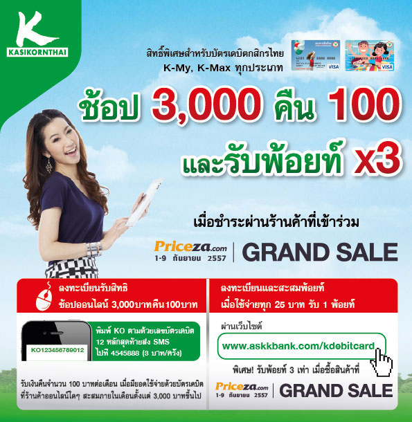 4 ก.ย. 57 1,309สิทธิพิเศษสำหรับบัตรเดบิตกสิกรไทย* ช้อป 3,000 คืน 100 และรับพ้อยท์ X3