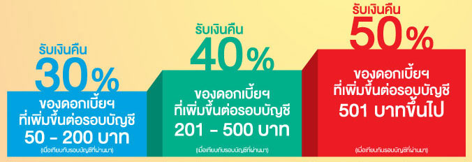 รับทันทีเงินคืนสูงสุด 50% ของดอกเบี้ยฯ ที่เพิ่มขึ้น เมื่อเทียบกับรอบบัญชีที่ผ่านมารับได้ถึง 3 รอบ ตั้งแต่รอบกรกฎาคม เทียบ มิถุนายน, รอบ สิงหาคม เทียบ กรกฎาคม, รอบ กันยายน เทียบ สิงหาคม 2557 (รอบใดก็ได้)