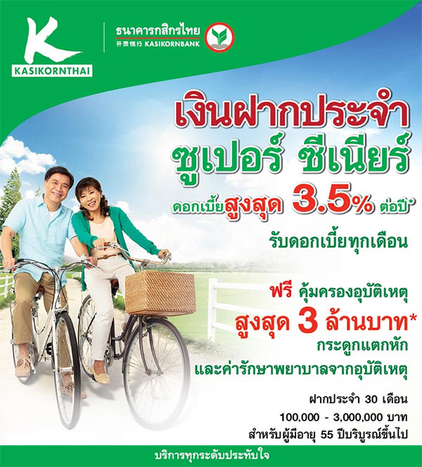 บัญชีเงินฝากประจำซูเปอร์ ซีเนียร์ ให้ดอกเบี้ยสูงสุด 3.50% ต่อปี รับดอกเบี้ยรายเดือน พร้อมฟรี ความคุ้มครองอุบัติเหตุสูงสุด 3 ล้านบาท*