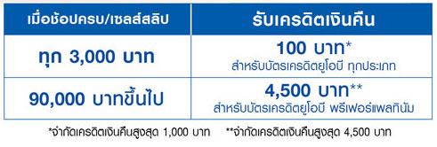 - *จำกัดเครดิตเงินคืนสูงสุด 1,000 บาทสำหรับบัตรทุกประเภท