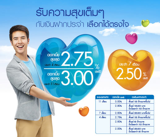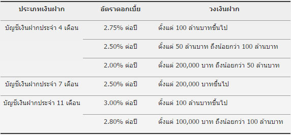 - บัญชีเงินฝากประจำ 11 เดือน ผู้ฝากสามารถเปิดบัญชี และฝากเงินแต่ละยอดเงินฝาก ด้วยจำนวนเงินขั้นต่ำ 100,000 บาท โดยผู้ฝากต้องเปิดบัญชีด้วยเงินที่ไม่ได้โอนหรือถอนมาจากบัญชีเงินฝากที่มีอยู่กับธนาคาร