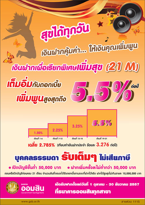 เต็มอิ่มกับดอกเบี้ยเพิ่มพูนสูงสุดถึง 5.50% ต่อปี กับบัญชีเงินฝากเผื่อเรียกพิเศษเพิ่มสุข จากธนาคารออมสิน เป็นบัญชีเงินฝากระยะยาว 21 เดือน สำหรับลูกค้าบุคคลธรรมดา อายุตั้งแต่ 7 ปีขึ้นไป และลูกค้านิติบุคคลทุกประเภท เปิดบัญชีขั้นต่ำเพียง 50,000 บาท และจ่ายดอกเบี้ยทุกเดือน