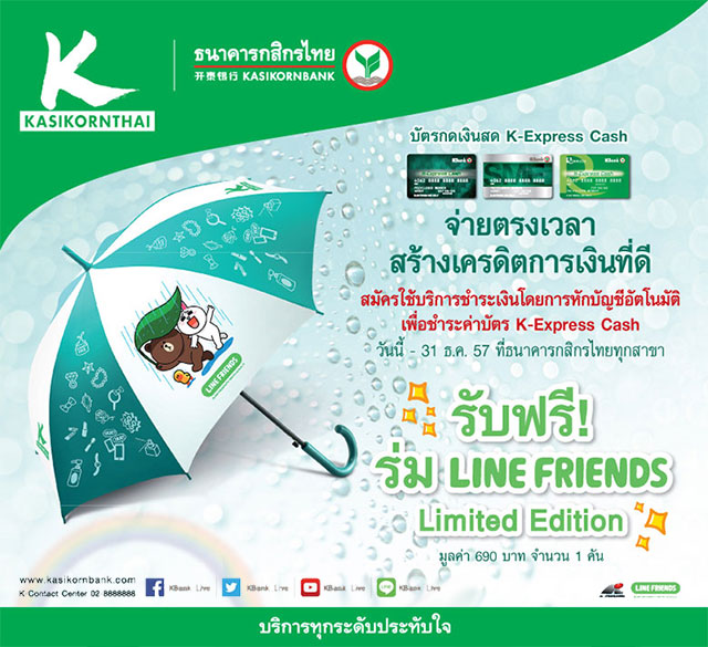 เงื่อนไขการเข้าร่วมโครงการสมัครบริการชำระเงินโดยการหักบัญชีอัตโนมัติ รับร่ม LINE FRIENDS - ของรางวัล ร่ม LINE FRIENDS จำนวน 1 คัน มูลค่า 690 บาท มอบให้สำหรับลูกค้าใหม่ที่สมัคร K-Express Cash (สินเชื่อเงินสดทันใจกสิกรไทย) ทุกประเภท พร้อมสมัครใช้บริการชำระรายการใช้จ่ายสินเชื่อดังกล่าวโดยการหักบัญชีอัตโนมัติ ตั้งแต่วันที่ 15 กันยายน 2557 ถึง 31 ธันวาคม 2557 และ/หรือลูกค้า K-Express Cash (สินเชื่อเงินสดทันใจกสิกรไทย) ปัจจุบัน ทุกประเภทก่อนวันที่ 15 กันยายน 2557 ที่สมัครใช้บริการชำระรายการใช้จ่ายสินเชื่อโดยการหักบัญชีอัตโนมัติตั้งแต่วันที่ 15 กันยายน 2557 ถึง 31 ธันวาคม 2557