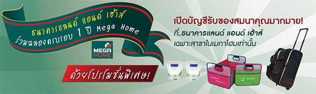 โปรโมชั่นพิเศษ!! ฉลองครบรอบ 1 ปี MEGA HOME เพียงเปิดบัญชีที่ธนาคารแลนด์ แอนด์ เฮ้าส์ รับฟรี ของสมนาคุณมากมาย