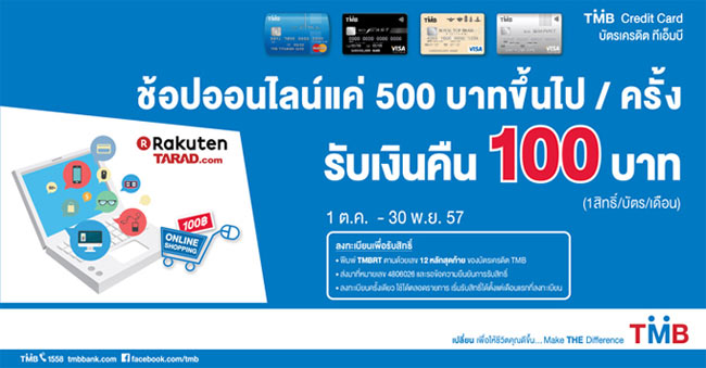 - เมื่อซื้อสินค้าผ่านบัตรเครดิต TMB ตั้งแต่ 500 บาทขึ้นไป/เซลล์สลิปที่เว็บไซต์ www.tarad.com รับเงินคืน 100 บาท (คิดจากยอดใช้จ่ายจริงหลังจากหักส่วนลดต่างๆ แล้ว) ระหว่างวันที่ 1 ต.ค. - 30 พ.ย. 57 มีสิทธิ์ได้รับเงินคืนจำนวน 100 บาท (สูงสุด 200 บาท/บัตร ตลอดรายการ)