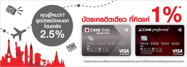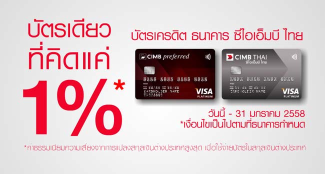 ใช้จ่ายผ่านบัตร CIMB Thai Visa Platinum ในสกุลเงินต่างประเทศ ด้วยค่าธรรมเนียมความเสี่ยงจากการแปลงสกุลเงินต่างประเทศเพียง 1% จากปกติ 2.5% วันนี้ - 31 มกราคม 2558