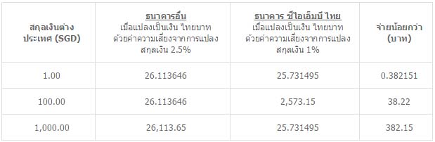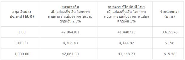 ค่าใช้จ่ายใดๆ ที่เกิดจากการใช้จ่ายผ่านบัตรเครดิต ธนาคาร ซีไอเอ็มบี ไทย (รวมถึงการเบิกถอนเงินสดล่วงหน้า) เป็นสกุลเงินตราต่างประเทศจะถูกเรียกเก็บเป็นเงินบาทไทยตามอัตราแลกเปลี่ยนที่ธนาคารถูกเรียบเก็บจากบริษัทบัตรเครดิตที่ธนาคารเป็นสมาชิกอยู่ ณ วันที่มีการเรียกเก็บยอดค่าใช้จ่ายดังกล่าวกับธนาคาร