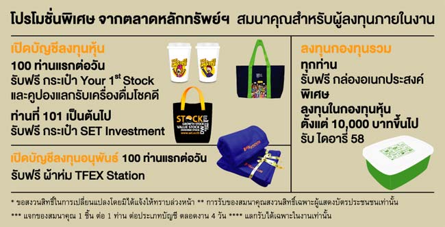 โปรโมชั่นพิเศษ จากตลาดหลักทรัพย์ฯ สมนาคุณสำหรับผู้ลงทุนภายในงาน
