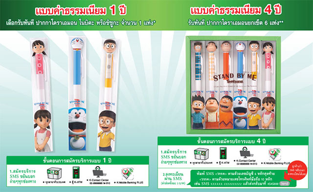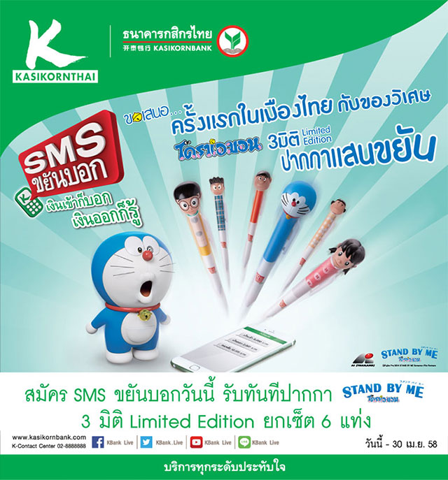 สมัคร SMS ขยันบอกที่ธนาคารกสิกรไทยวันนี้ รับทันทีปากกา STAND BY ME โดราเอมอน 3 มิติ