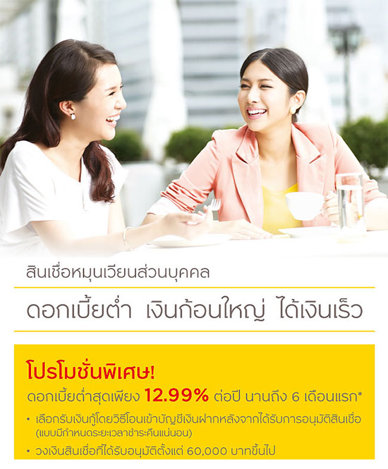 - อัตราดอกเบี้ย 12.99% ต่อปี เฉพาะ 6 เดือนแรก สำหรับการรับเงินกู้โดยวิธีโอนเงินเข้าบัญชีเงินฝากเท่านั้น