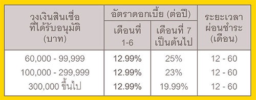 - วงเงินสินเชื่อที่ได้รับอนุมัติตั้งแต่ 60,000 บาทขึ้นไป