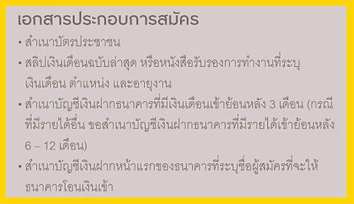 - เป็นผู้มีรายได้ประจำต่อเดือนตั้งแต่ 30,000 บาทขึ้นไป
