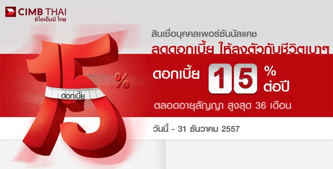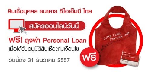 ข้อกำหนดและเงื่อนไขของโปรแกรมส่งเสริมการขาย สิทธิพิเศษสำหรับผู้สมัครและได้รับการอนุมัติสินเชื่อบุคคลเพอร์ซันนัลแคชตั้งแต่ 1 สิงหาคม - 31 ธันวาคม 2557 เท่านั้น - รายการส่งเสริมการขายนี้ ลูกค้า 1 รายเลือกได้เพียง 1 โปรแกรมเท่านั้น โดยธนาคารสงวนสิทธิ์ในการพิจารณาอนุมัติกำหนดวงเงินอัตราดอกเบี้ยพิเศษของโปรแกรมส่งเสริมการขายนี้ หรือปฏิเสธคำขอสินเชื่อภายใต้หลักเกณฑ์การพิจารณาสินเชื่อของธนาคาร