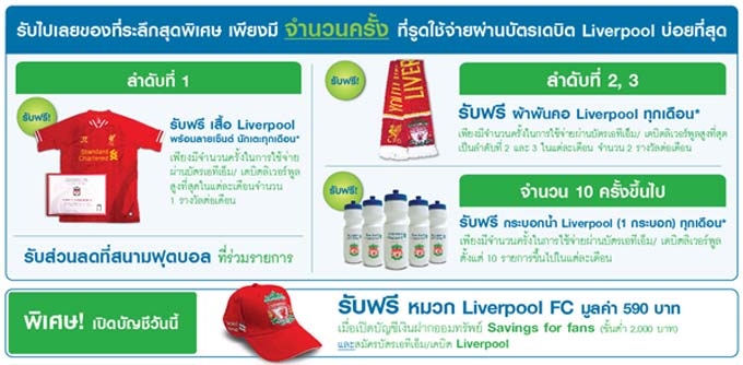 - ลูกค้าที่ได้รับรางวัลเสื้อ Liverpool จากรายการส่งเสริมการขายบัญชีเงินฝากออมทรัพย์ Savings for fans ระหว่างวันที่ 1 เมษายน - 30 กันยายน 2557 ไปแล้วจะได้รับสิทธิเฉพาะรางวัลผ้าพันคอ Liverpool และกระบอกน้ำ Liverpool เท่านั้น