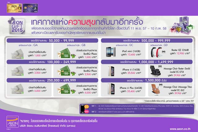 AEON GIFT 2015 รับของกำนัลสุดพิเศษ เพียงสะสมยอดใช้จ่ายผ่านบัตรเครดิตอิออนจากทุกร้านค้าทั่วโลก