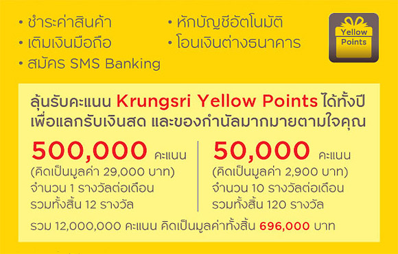 กรุงศรีโดนใจ จ่าย-ลุ้น-ล้าน ลุ้นรับคะแนน Krungsri Yellow Points ได้ทั้งปี เพื่อแลกรับเงินสด และของกำนัลมากมาย
