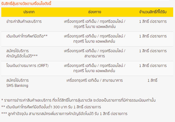 - รายการชำระค่าสินค้าและบริการ,โอนเงินต่างธนาคาร, SMS Banking, บริการหักบัญชีอัตโนมัติ และเติมเงินมือถือ ที่จะได้สิทธิ์ในการลุ้นรางวัล จะต้องเป็นการทำรายการ ภายในประเทศเท่านั้น