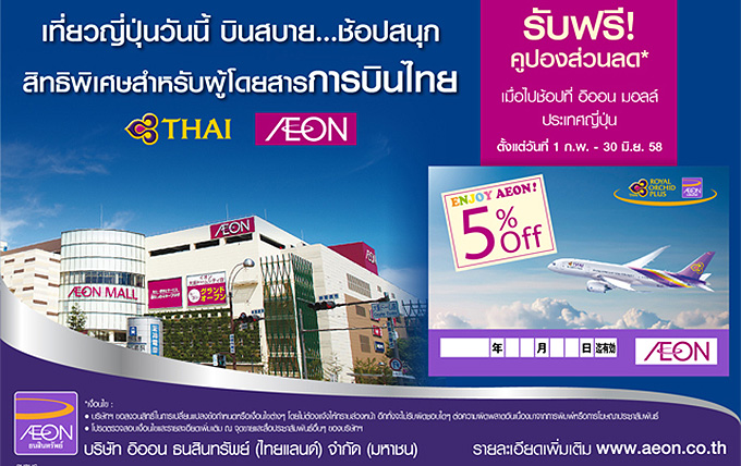 สิทธิพิเศษสำหรับผู้โดยสารการบินไทย "รับฟรี! คูปองส่วนลด 5% เมื่อไปช้อปที่ อิออน มอลล์ ประเทศญี่ปุ่น" ตั้งแต่ 1 กุมภาพันธ์ - 30 มิถุนายน 2558