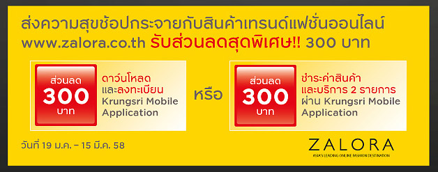 ส่งความสุขช้อปกระจายกับสินค้าเทรนด์แฟชั่นออนไลน์ www.zalora.co.th รับส่วนลดสุดพิเศษ!! 300 บาท กับ Krungsri Mobile application