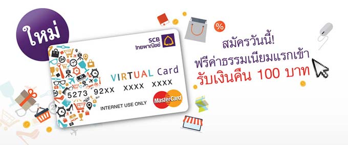 สมัครวันนี้! ฟรีค่าธรรมเนียมแรกเข้า รับเงินคืน 100 บาท วันนี้ - 30 มิถุนายน 2558 เมื่อสมัครใช้บริการบัตรไทยพาณิชย์เวอร์ชวลพรีเพด และมีรายการใช้จ่ายผ่านบัตร ภายใน 30 วันนับจากวันเปิดใช้บัตรของแต่ละใบ