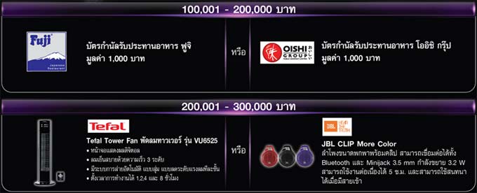 - ยอดใช้จ่ายสะสมผ่านบัตรต่อรอบบัญชีที่จะได้รับสิทธิแลกของรางวัลตามรายการนี้ จะต้องไม่เกินวงเงินบัตรเครดิตที่ธนาคารกำหนดเท่านั้น