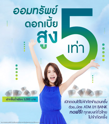 โปรโมชั่นเงินฝากออมทรัพย์ดอกเบี้ยสูง 5 เท่า กับบัญชีเงินฝากไม่ประจำ LH Bank สำหรับลูกค้าบุคคลธรรมดา วงเงินเปิดบัญชีขั้นต่ำเพียง 5,000 บาท สามารถเบิกถอนได้ไม่จำกัดจำนวนครั้งด้วยบัตร ATM LH BANK กดฟรี! ทุกแบงก์ทั่วไทยไม่จำกัดครั้ง