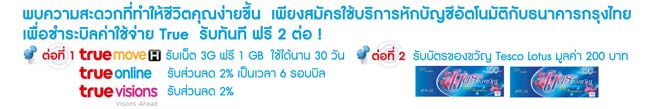 ลูกค้าที่สมัครบริการหักบัญชีอัตโนมัติกับธนาคารกรุงไทย เพื่อชำระค่าสินค้าและบริการในกลุ่ม True ตั้งแต่ 1 ก.พ. - 30 เม.ย. 2558 จะได้รับบัตรของขวัญ Tesco Lotus มูลค่า 200 บาททันที เมื่อชำระค่าสินค้าและบริการติดต่อกัน 3 รอบบิล จำนวนรวมทั้งสิ้น 2,360 รางวัล