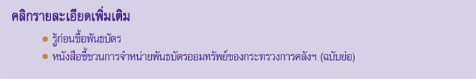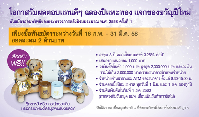 เงื่อนไขการรับสิทธิ์ - เฉพาะลูกค้าที่มียอดซื้อพันธบัตรสะสม 2 ล้านบาท ระหว่างวันที่ 16 ก.พ. - 31 มี.ค. 58