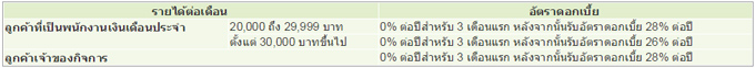 - สำหรับลูกค้าที่ใช้บริการเบาใจ รับดอกเบี้ยพิเศษ 0% ต่อปี สำหรับ 3 เดือนแรก หลังจากครบกำหนด 3 เดือนแรกตามเงื่อนไขธนาคารฯ จะเรียกเก็บอัตราดอกเบี้ยในอัตราปกติ รายละเอียดตามตารางด้านล่าง
