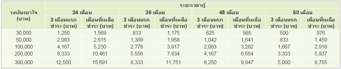 ตัวอย่างการผ่อนชำระสินเชื่อเบาใจ ที่ระยะเวลาการกู้ 24 - 60 เดือนที่อัตราดอกเบี้ย 0% 3 เดือนแรก หลังจากนั้นอัตราดอกเบี้ย 26% ต่อปี