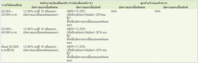 - สำหรับลูกค้าใหม่ที่ใช้บริการโอนเงินเข้าบัญชีธนาคารฯ จะคิดอัตราดอกเบี้ย 12.99% ต่อปี 10 เดือนแรก ซึ่งเป็นอัตราดอกเบี้ยแบบลดต้นลดดอก นับตั้งแต่วันที่ธนาคารฯ โอนเงินเข้าบัญชีหลังจากครบกำหนด 10 เดือนแรก ตามเงื่อนไขธนาคารฯ จะเรียกเก็บอัตราดอกเบี้ยตามที่กำหนด ดังนี้