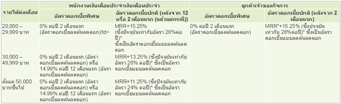 *อัตราดอกเบี้ยข้างต้นอาจจะมีการเปลี่ยนแปลงไปตามอัตราดอกเบี้ย MRR ที่ประกาศเปลี่ยนแปลง ซึ่ง MRR ณ วันที่ 5 มกราคม 2558 เท่ากับ 12.75% ต่อปี ทั้งนี้หาก ณ ขณะใดขณะหนึ่ง อัตราดอกเบี้ยรวมคำนวณแล้ว ได้เกินกว่าอัตราร้อยละ 28% ต่อปี ให้อัตราดอกเบี้ย ณ ขณะดังกล่าว เท่ากับอัตรา 28% ต่อปี