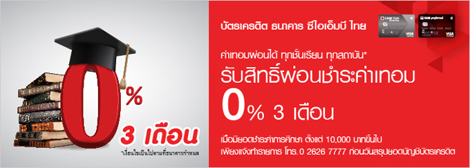 รับสิทธิ์ผ่อนชำระค่าเทอม 0% 3 เดือน ผ่านบัตรเครดิต ธนาคาร ซีไอเอ็มบี ไทย เมื่อมียอดชำระค่าการศึกษาตั้งแต่ 10,000 บาทขึ้นไป เพียงแจ้งทำรายการผ่าน Care Center โทร. 0-2626-7777 ทุกวัน ตั้งแต่เวลา 7.00 - 19.00 น. ก่อนวันสรุปยอดบัญชีบัตรเครดิต