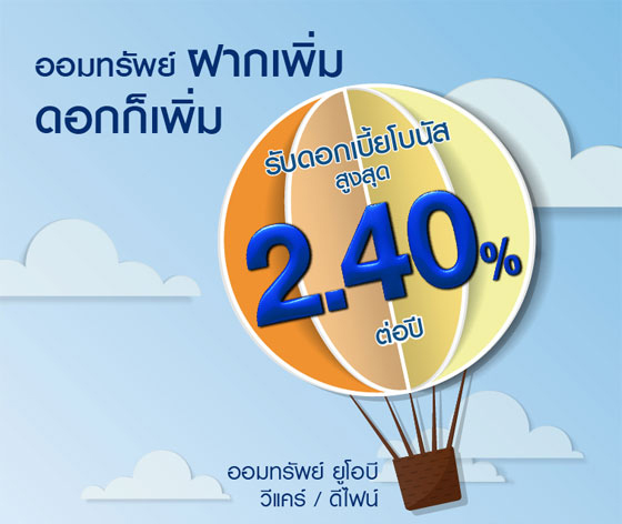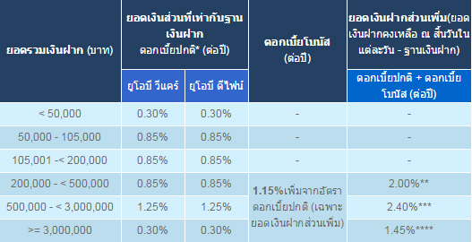 - สำหรับบัญชีออมทรัพย์ ยูโอบี วีแคร์ / ยูโอบี ดีไฟน์ ที่เปิดก่อน 29 สิงหาคม 2557 - 28 พฤษภาคม 2558