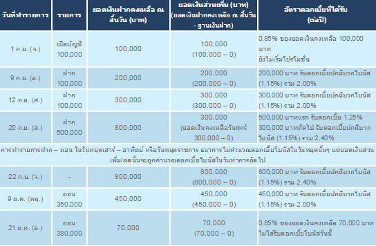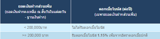 - ลูกค้าจะได้รับดอกเบี้ยโบนัสในกรณีที่มียอดเงินฝากส่วนเพิ่มในแต่ละวันเทียบกับฐานเงินฝากคงเหลือ ณ สิ้นวันที่ 28 สิงหาคม 2557 ตั้งแต่ 200,000 บาทขึ้นไป