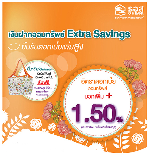 เงินฝากออมทรัพย์ Extra Savings รับดอกเบี้ยออมทรัพย์บวกเพิ่ม 1.50% ต่อปี จากธนาคารอาคารสงเคราะห์ - เงินฝากประเภทออมทรัพย์