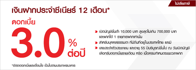 เงินฝากประจำซีเนียร์ 12 เดือน ดอกเบี้ย 3.00% ต่อปี ไม่เสียภาษี - เปิดบัญชีขั้นต่ำ 10,000 บาท สูงสุดไม่เกิน 700,000 บาท และฝากได้ 1 รายการฝากเท่านั้น
