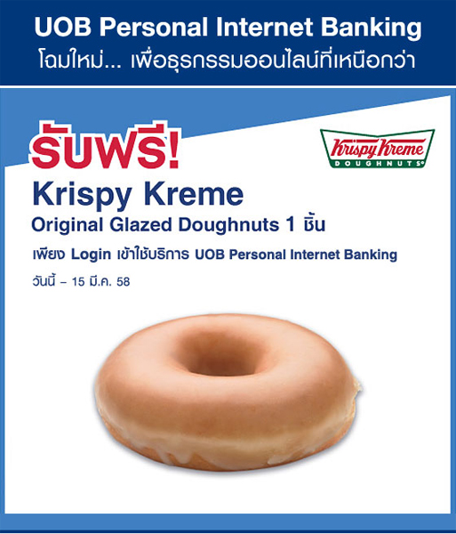 หมายเหตุ:การเข้าใช้บริการ UOB Personal Internet Banking ได้แก่ การ login เข้าใช้บริการเพื่อตรวจสอบ, สรุปข้อมูลบัญชี, การตรวจสอบประวัติการทำรายการ, การตรวจสอบสถานะการทำรายการ, บริการขอเพิ่มวงเงินบัตรเครดิตชั่วคราว, บริการโอนเงินทุกประเภท, บริการชำระค่าสินค้าและบริการ, บริการเกี่ยวกับเช็ค, บริการธนาณัติออนไลน์, บริการขอรับและเปิดใช้ SecurePlus token และบริการอื่นๆ ภายใต้ UOB Personal Internet Banking ธนาคารจะดำเนินการจัดส่ง SMS แจ้งสิทธิพิเศษให้ลูกค้าผู้ที่ได้รับสิทธิ์ทราบภายใน 7 วันทำการหลังจากวันที่ลูกค้า เข้าใช้บริการ UOB Personal Internet Banking - ลูกค้าผู้ที่ได้รับสิทธิ์จะต้องใช้หมายเลขมือถือที่ใช้รับ SMS-OTP ของบริการ UOB Personal Internet Banking เพื่อรับ สิทธิ์โดยการกดโทรออกตามเบอร์ที่ระบุไว้ที่หน้าร้าน Krispy Kreme และแสดงรหัสกับพนักงานร้าน Krispy Kreme ภายในวัน/เวลาที่กำหนดในข้อความ เพื่อรับ Krispy Kreme Original Glazed Doughnut 1 ชิ้น ตั้งแต่วันที่ 1 ม.ค. - 15 มี.ค. 58 เท่านั้น โดยลูกค้าสามารถติดต่อขอรับได้ที่ร้าน Krispy Kreme ทุกสาขา ยกเว้นสาขาในสนามบินสุวรรณภูมิ และสนามบินดอนเมือง
