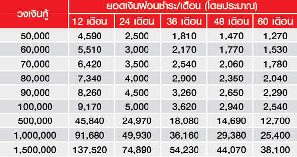 ตารางผ่อนชำระสินเชื่อบุคคลเพอร์ซันนัลแคช ดอกเบี้ย 18% ต่อปี