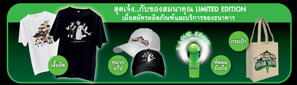 เงื่อนไข - บัตรคอนเสิร์ต เทศกาลเบิกบานใจ ตอน KBank แก๊ง 3 ช่า คาราบาว สงวนสิทธิ์เฉพาะลูกค้าที่สมัครบัตรเดบิต แก๊ง 3 ช่า คาราบาว หรือลูกค้าที่เปลี่ยนบัตรเดบิต แก๊ง 3 ช่า คาราบาว เท่านั้น บัตรคอนเสิร์ตแบบธรรมดา มูลค่า 500 บาท และบัตรคอนเสิร์ต VIP มูลค่า 800 บาท