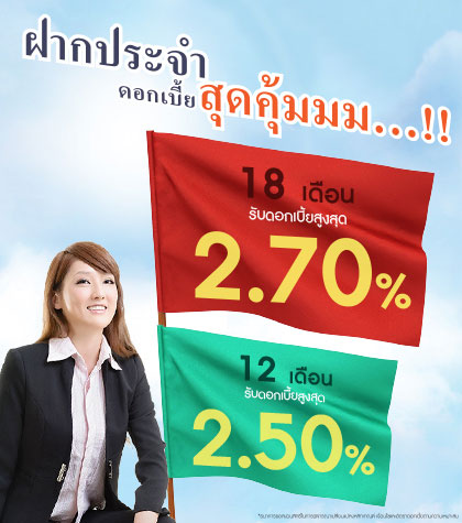 | เงินฝากประจำ 18 เดือน | ตั้งแต่ 1,000 บาทขึ้นไป | 2.70 % |