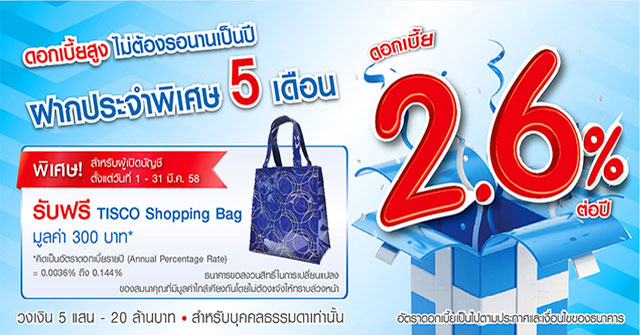 บัญชีเงินฝากประจำพิเศษ 5 เดือน จากธนาคารทิสโก้ เป็นบัญชีสำหรับลูกค้าประเภทบุคคลธรรมดาเท่านั้น ระยะเวลาฝากสั้นเพียง 5 เดือน แต่ให้ดอกเบี้ยสูงถึง 2.60% ต่อปี เปิดบัญชีครั้งแรกขั้นต่ำ 500,000 บาทขึ้นไป